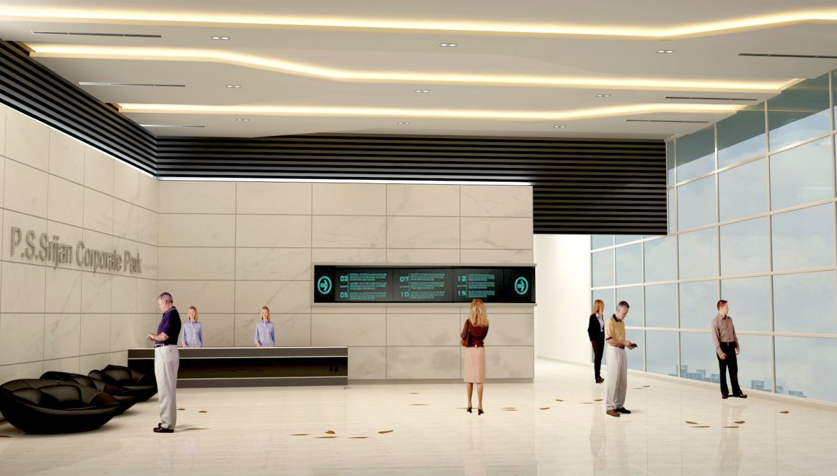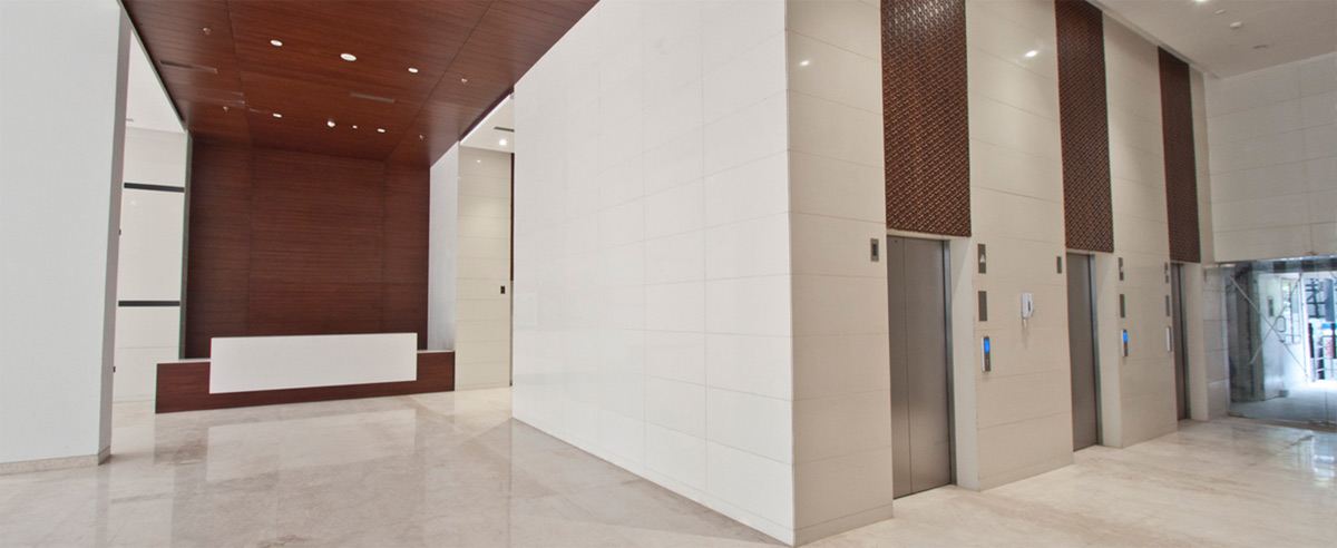 The modern and elegant design of the common areas of these two corporate towers leads to a creative work environment and inspires innovation, with a dash of handcrafted burnt solid wood & veneer paneling on the columns amidst the white sheathe common to the main entrance lobby and subsequent lift lobbies on all floors adding charm and sophistication to the scheme. The light tone of interiors is complemented by the playful staggering of leather finish black granite on the walls which enhances the futuristic look and tone of the theme.