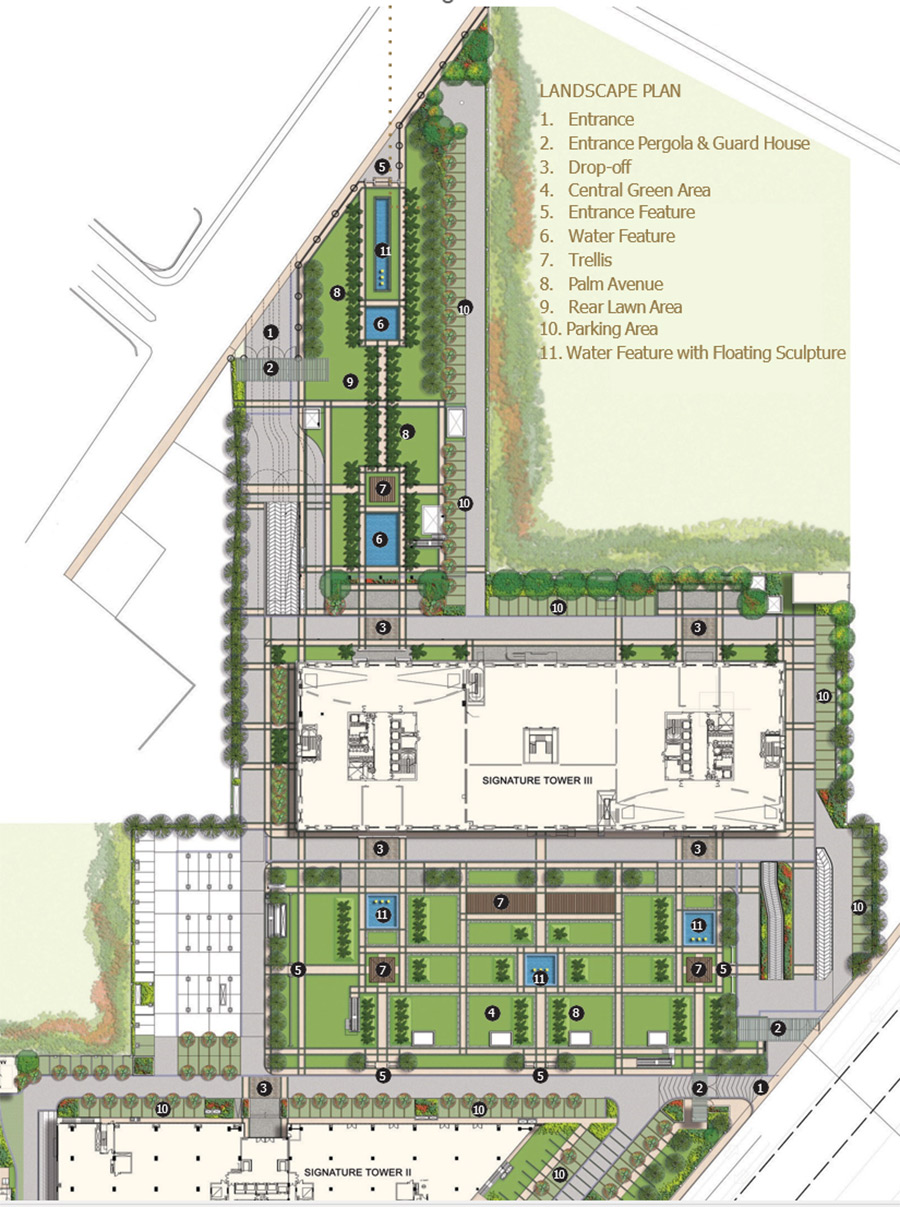 Key landscape features include combination of alternating wooden floors and green areas, water ponds with twisted columns that add visual intrigue to the clean lines, and carefully conceptualized paved zones surrounding the towers. The lush greenery, providing natural shade with its controlled lines and edges, harmonizes to achieve the intended ambience of the scheme.
