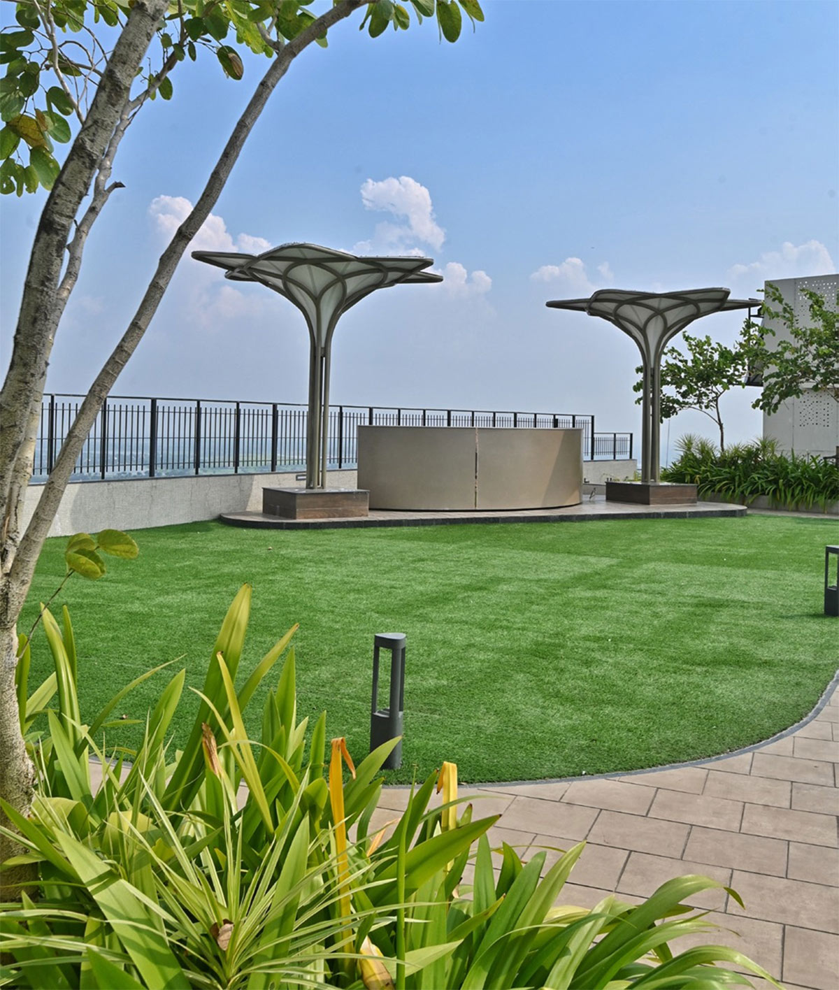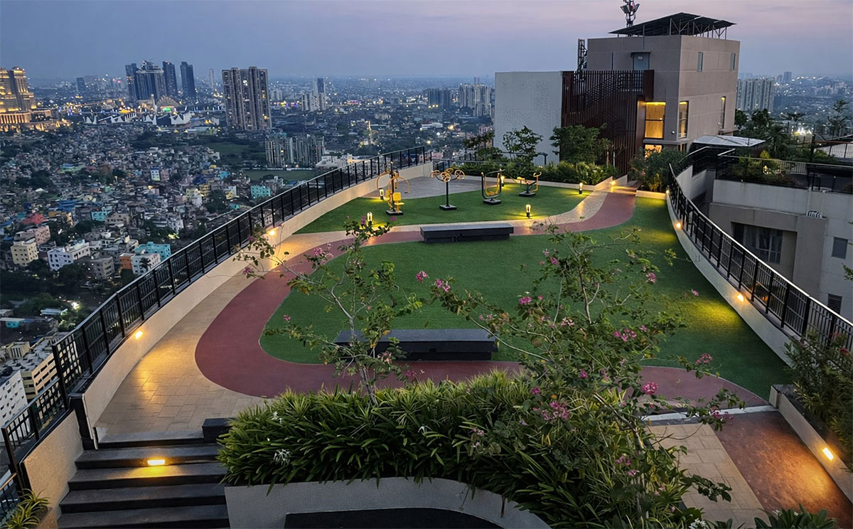 In Kolkata’s humid climate, the project introduces a lush, verdant green oasis high above the ground, with a generous tree canopy already established at podium levels. Services and mechanical areas are seamlessly camouflaged through intricate detailing, reinforcing a refined and premium skyline identity.