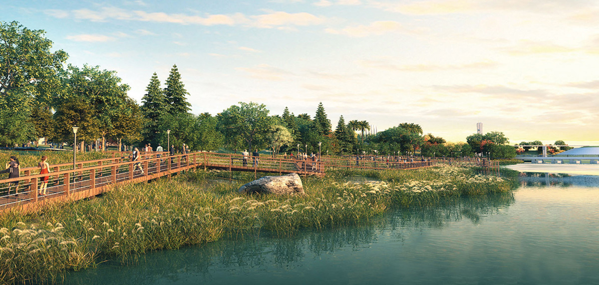 The central design for the park is a unique biodiversity belt stringed around the artificial lake accompanied by a constructed wetland curved out of the natural basin within the park. A walk through the park passing through the botanical gardens, the visitors centre and an exclusive water museum, students and citizens can get educated on the importance of water & ecology.