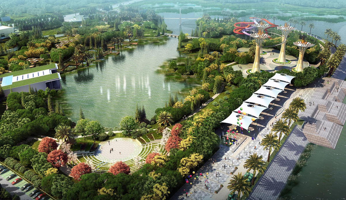 The basic zoning of the area comprises of a river facing land strip holding the vibrant riverfront promenade, the Ghats, the food street and the Flame of Life towers. The inner face of the land strip holds on one side the water park and on the other, an amphitheatre, both of which look inwardly towards a lake, created out of a natural depression.