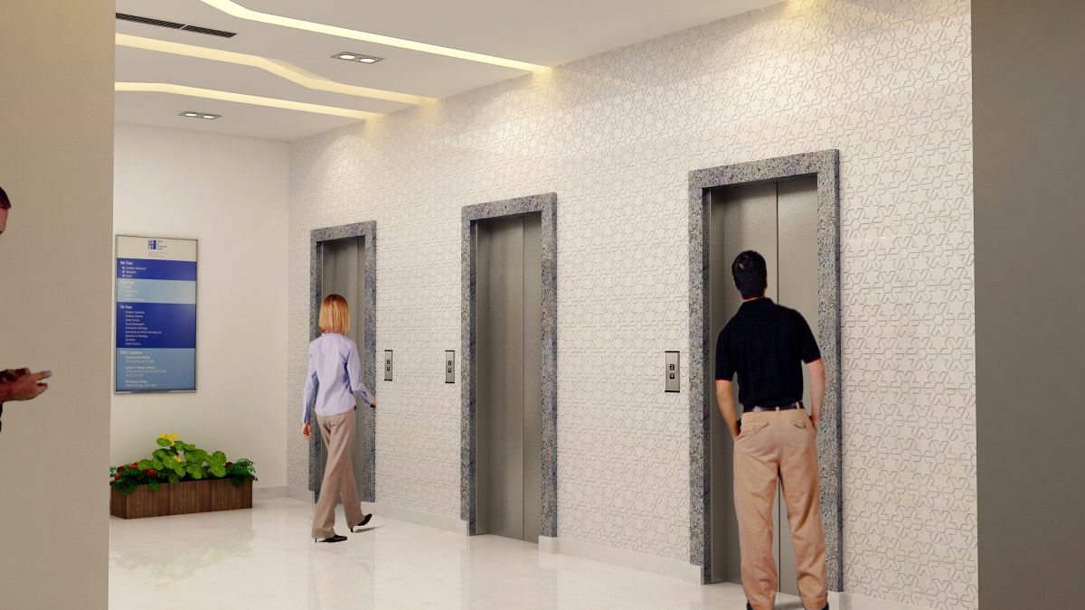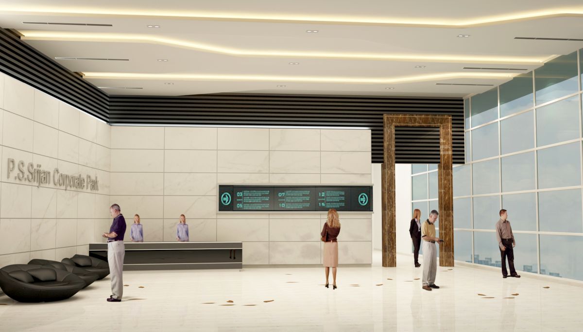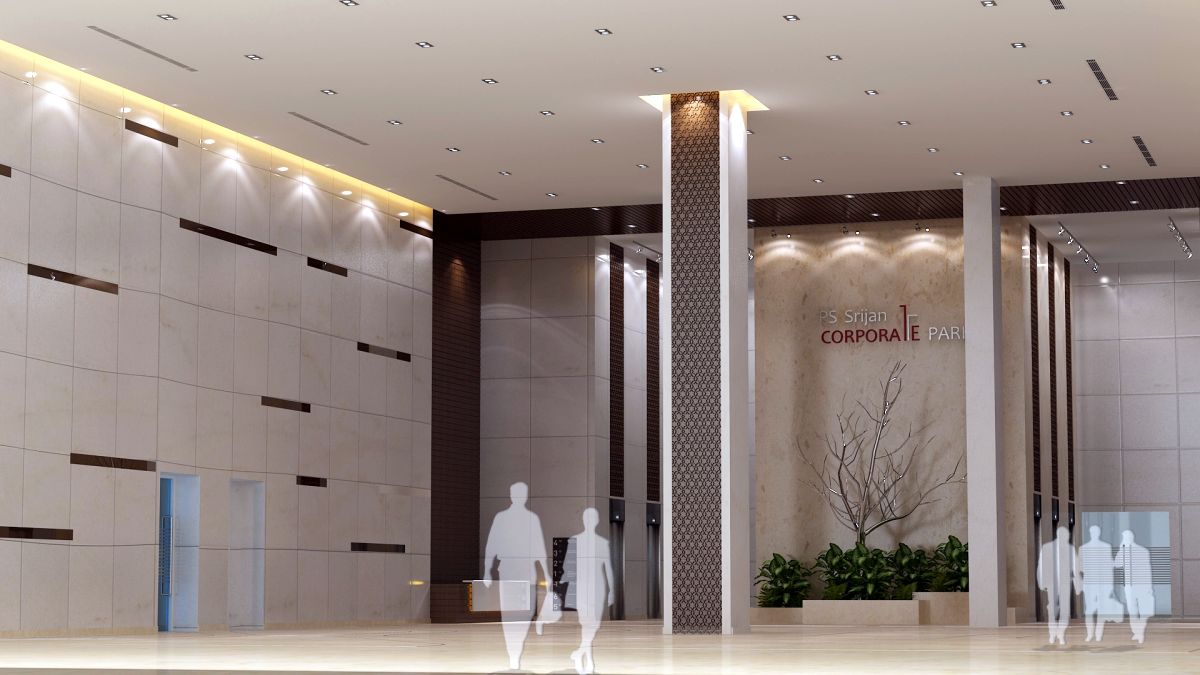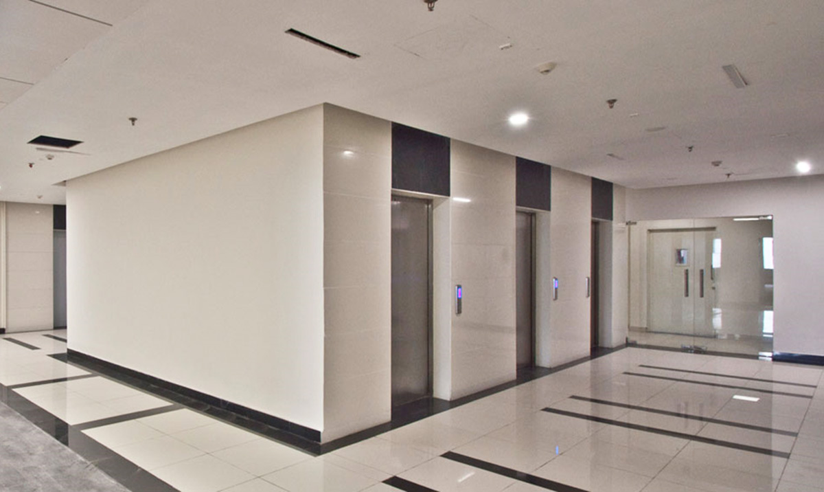 The modern and elegant design of the common areas of these two corporate towers leads to a creative work environment and inspires innovation, with a dash of handcrafted burnt solid wood & veneer paneling on the columns amidst the white sheathe common to the main entrance lobby and subsequent lift lobbies on all floors adding charm and sophistication to the scheme. The light tone of interiors is complemented by the playful staggering of leather finish black granite on the walls which enhances the futuristic look and tone of the theme.