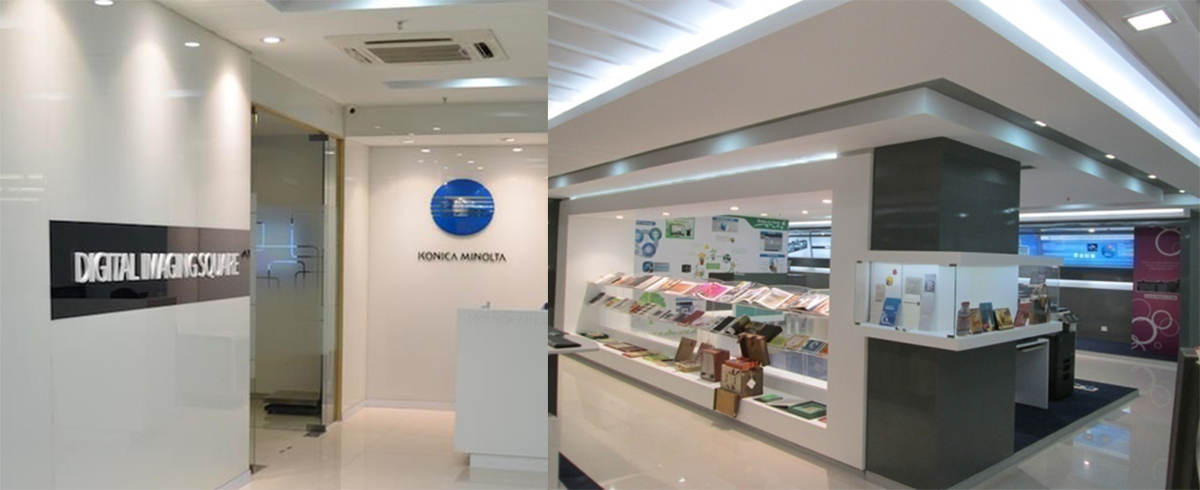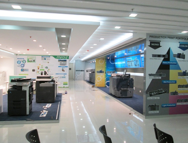 Experience centre of Konica Minolta to exhibit the print capacity and capability by the re-owned brand was established along with a training area for sales team and a small office too in cyber city, GURUGRAM.The styling was minimalist and matter of fact sp as to highlight the product range.