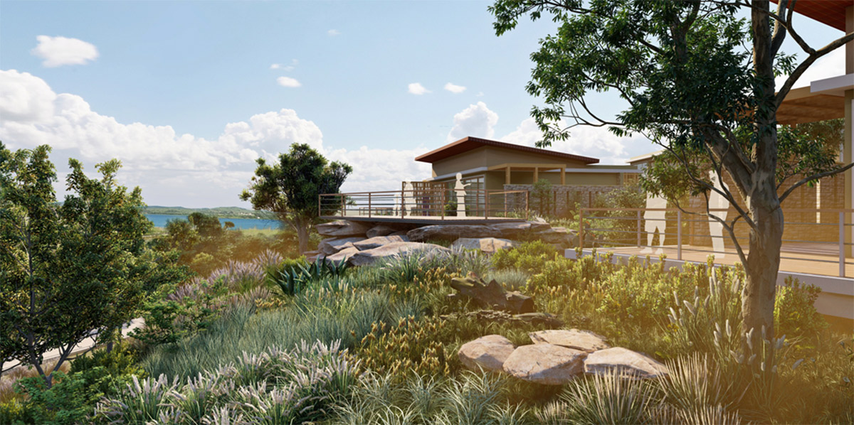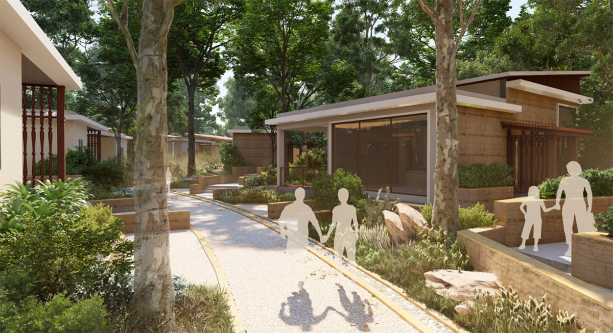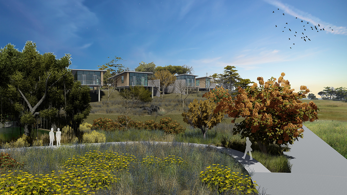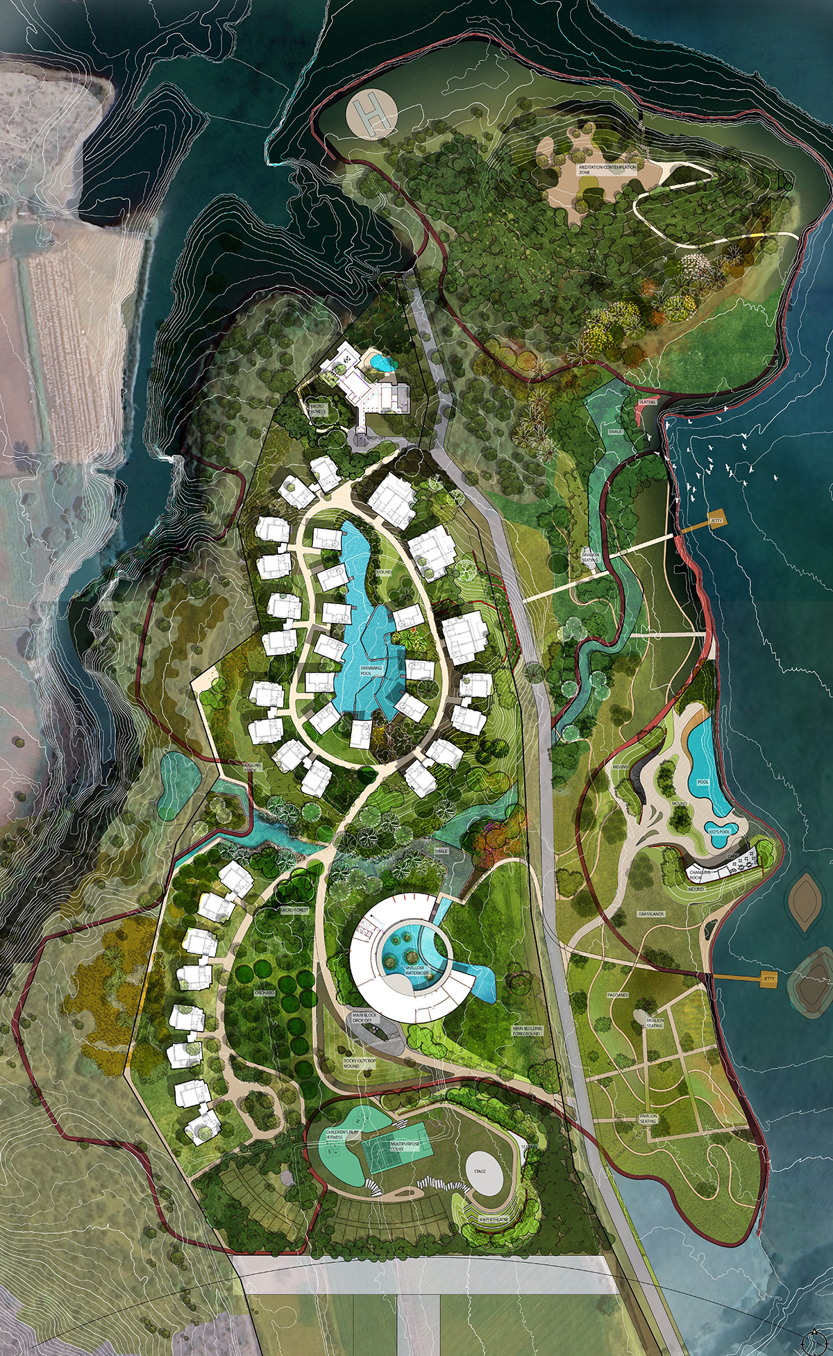 Perched almost like an island, this land parcel is surrounded by a large lake inhabited by crocodiles. Design Accord, in collaboration with Designers Group Architects, envisions extending the forest ecology with cottages nestled amidst dense native trees, savannah-like grasslands, and lagoon pools.