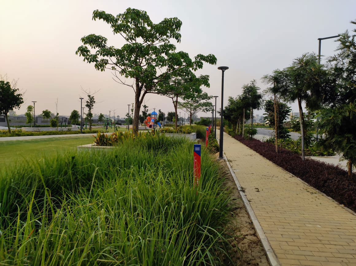 A unique aspect of this campus is its stormwater management system. The entire drainage is naturally integrated through bioswales along the length of the linear greens, channeling water to a sunken area that can hold excess water during the monsoon and also serve as a playground year-round. This is a one-of-a-kind design where 99 acres have been planned to sustain well without the need for a stormwater pipeline.