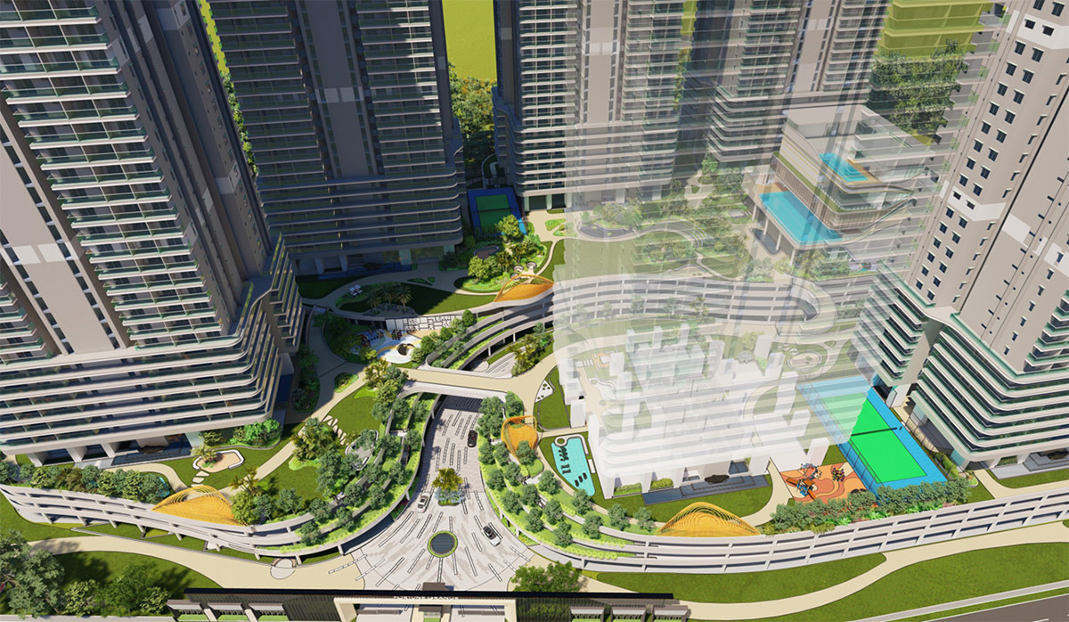 The Fortune Grande project is a high-density development featuring very tall towers. The open spaces have been thoughtfully designed across different tiers and levels.