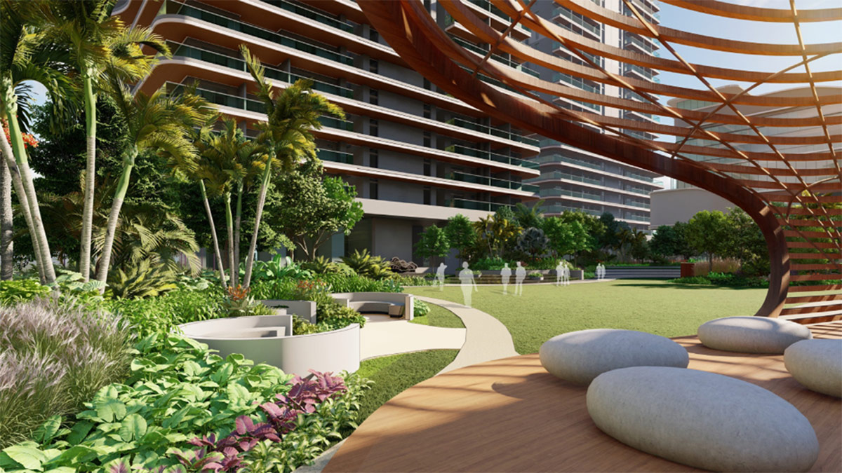 The stilt areas have been elevated to a double height, allowing the landscape to flow seamlessly through, creating accessible and engaging spaces beyond the towers. These stilt zones provide shaded areas with various amenities spread across the podium levels.