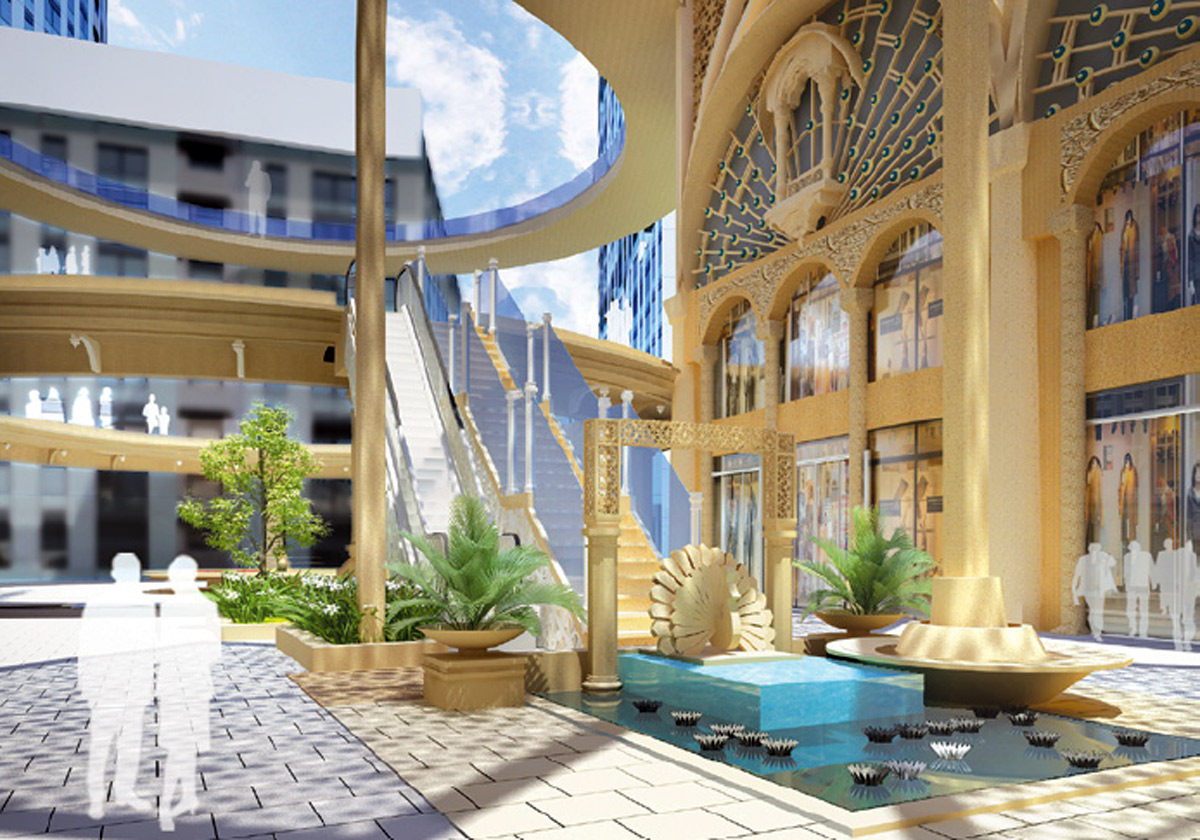 The essence of the lotus, symbolizing purity and divinity, is reflected in the geometry of the landscape. A grand recreation of an Indian palace walk captures the authenticity of royal Indian culture, while a double- height arcade framing the shopfronts, featuring a hierarchy of primary and secondary arches, adds an element of grandeur and magnificence. Intricate jaalis and jharokhas, with their detailed geometry, introduce another layer of regal charm while naturally filtering sunlight and wind, creating a comfortable and visually striking pedestrian experience.