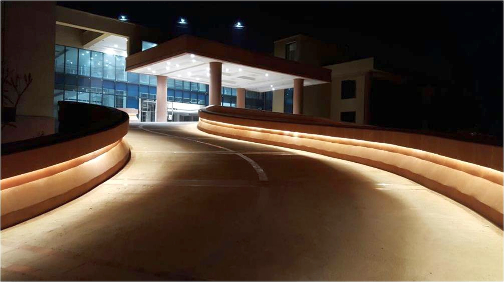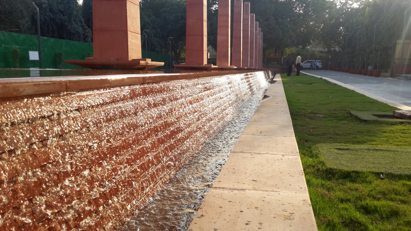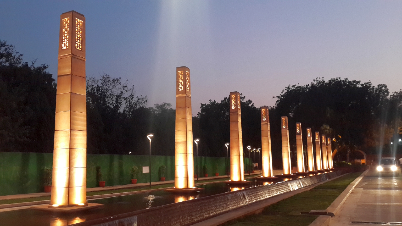The landscape design incorporates geometry and balance, intricate stonework, and the extensive use of water to define the open spaces, reflecting the scale and dignity of contemporary expressions of imperial aesthetics. A central water channel, adorned with fountain spouts and a unique floral petal fountain, graces the principal axes, reinforcing the visitor's focus. In the water body, ten stone jaali pillars with prominent capitals and intricate moldings enhance the night lighting effect while elevating the grandeur of the drive-in experience. The axis, composed of water features and pillars, reaffirms the concepts of power and order, echoing the most prominent architectural elements of the Parliament as visitors approach the building.